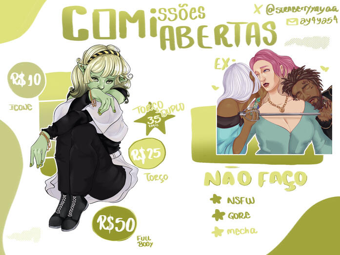 Aqui está os tipos de commission que eu faço junto dos preços e exemplos, na página de termos de serviço tem as coisas que eu não aceito.